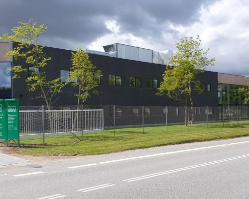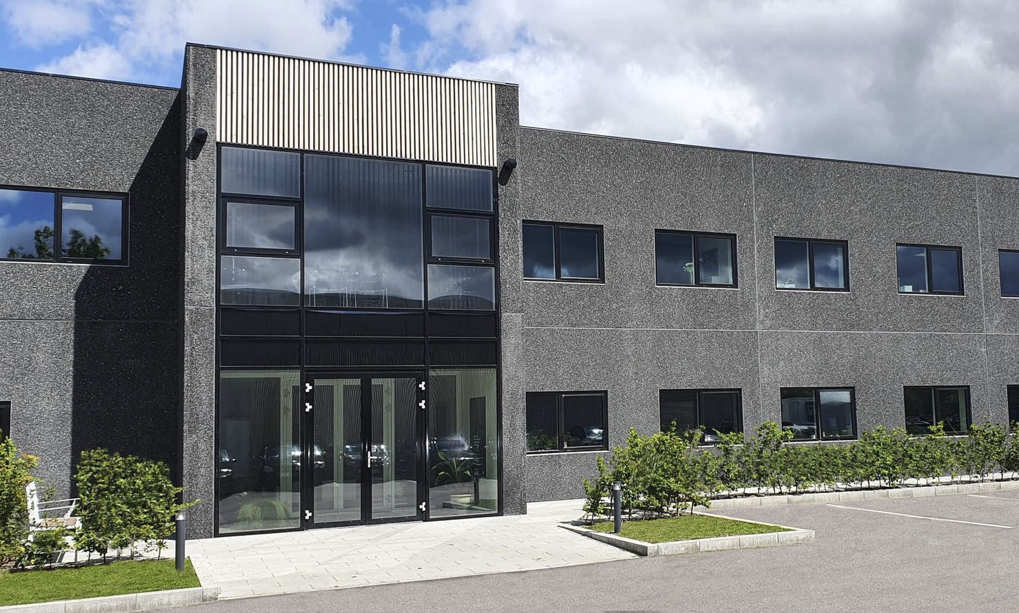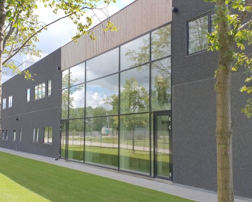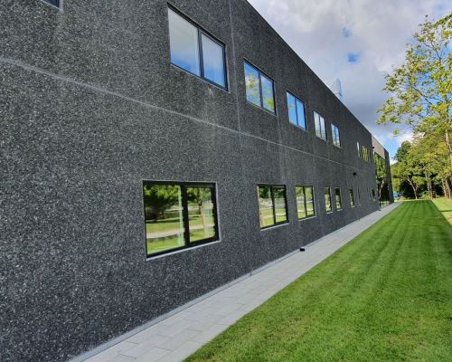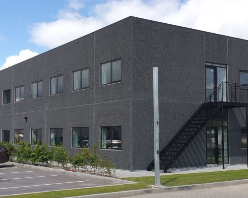 Erhvervsbyggeri:Administrationsbygning med facadeelementer i letbeton.