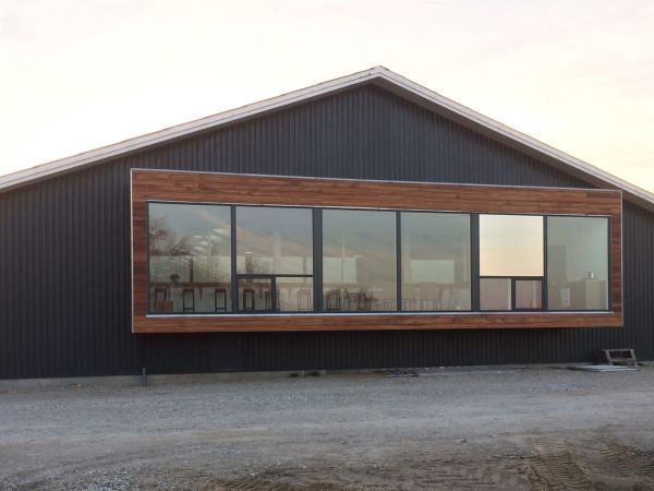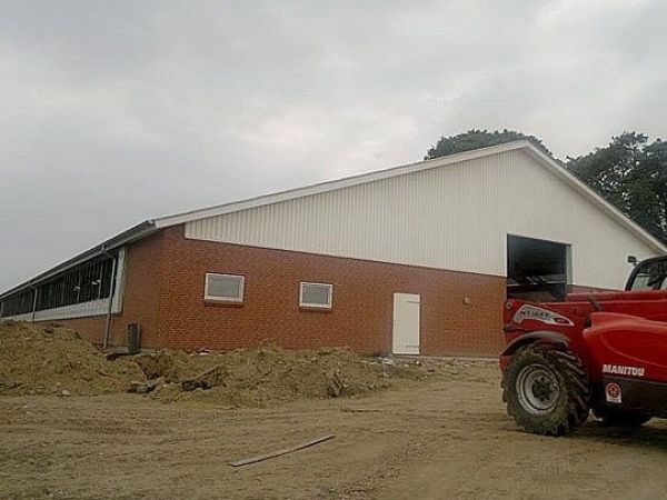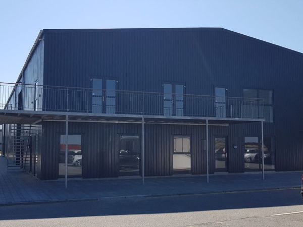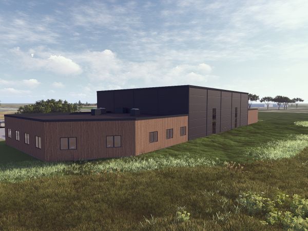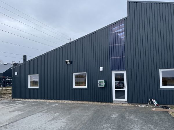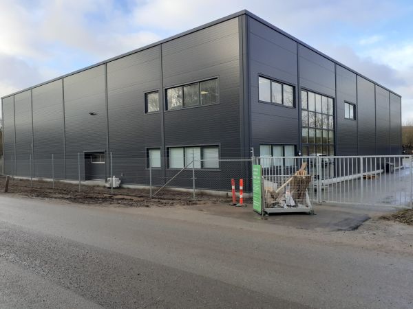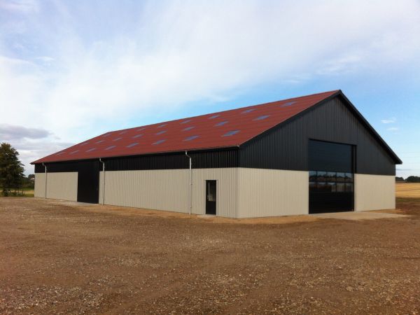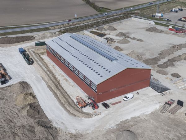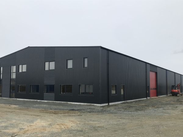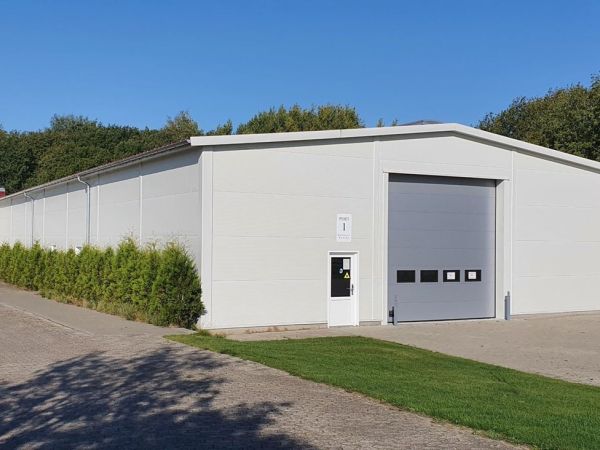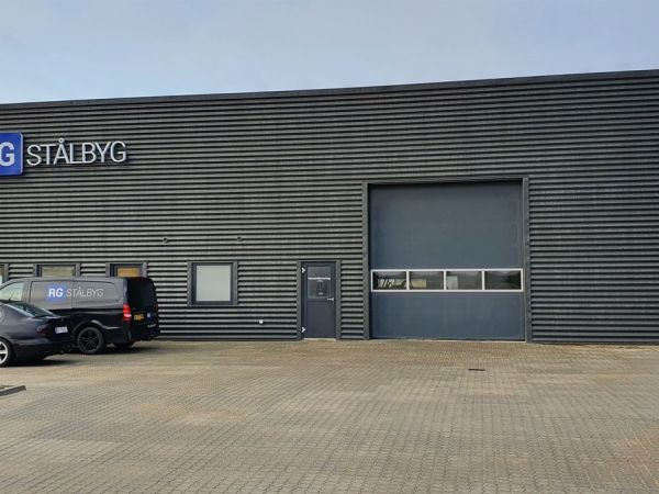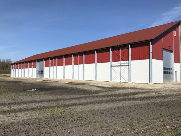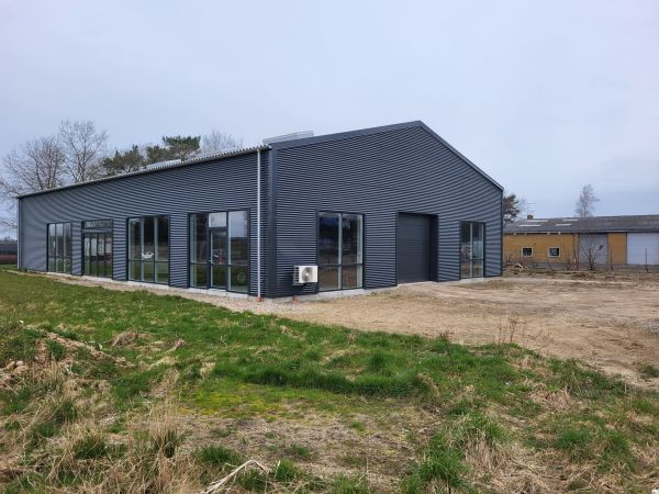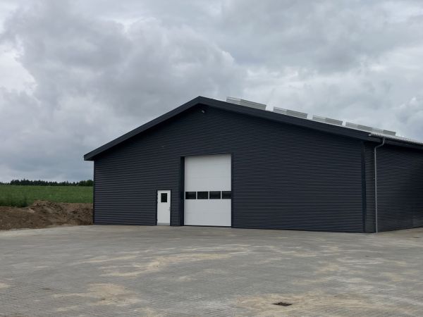 Lagerbygning opført i let trækonstruktion, beklædt med stålplader.