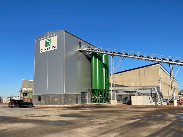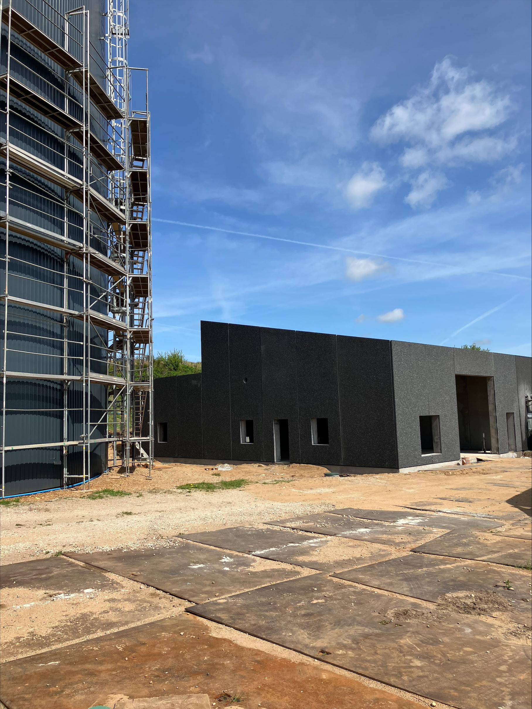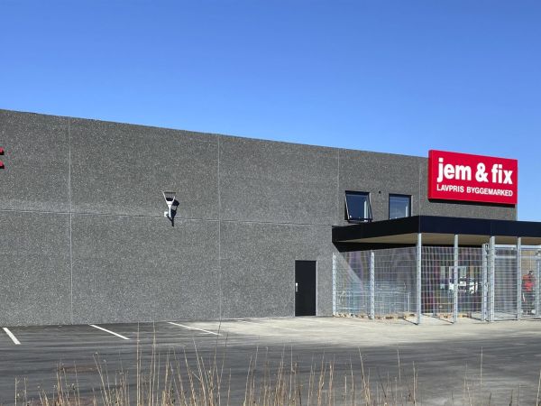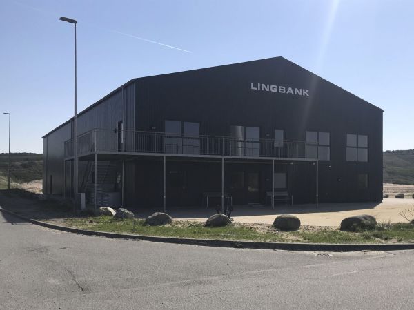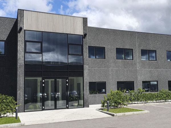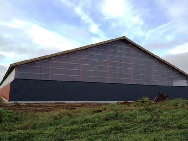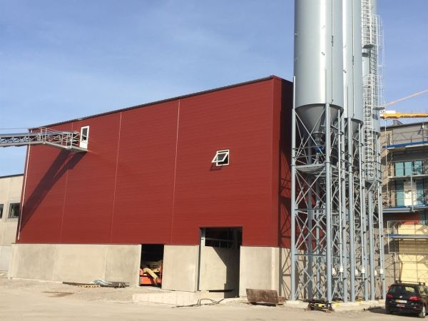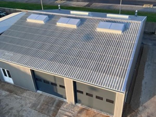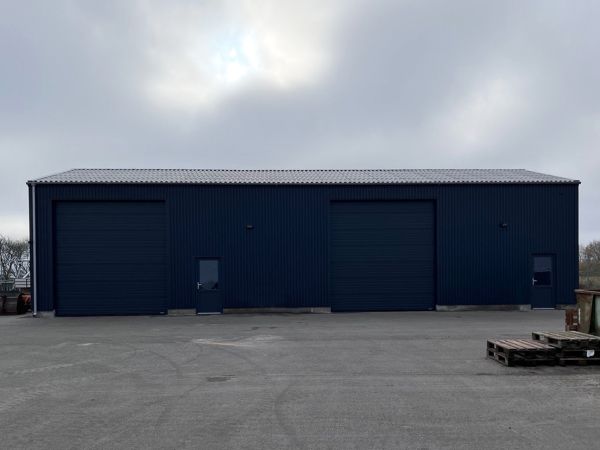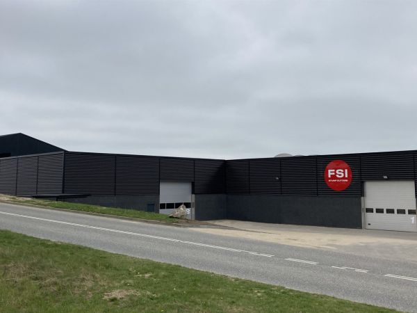 Lagerbygning opført i let trækonstruktion, beklædt med stålplader.